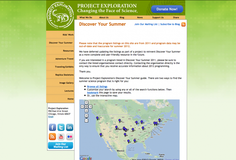 Project Exploration needed powerful search capabilities for their "Discover Your Summer" program. I worked with them to implement a custom Drupal site for creating and searching summer program listings by location, which would populate a Google map for easy viewing.
