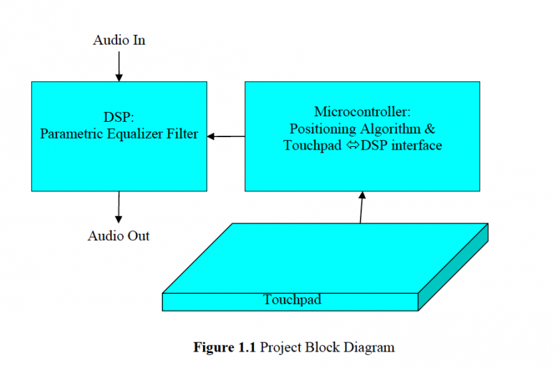 We designed and built a parametric audio equalizer that allowed a user to boost or attenuate a frequency based on their finger position on a custom built touchpad. By applying downward pressure on the pad, the filter Q/bandwidth would change as well. The advantage over traditional equalizers is the ability to quickly sweep the frequency spectrum in real time to gently or aggressively cut or boost a desired frequency.