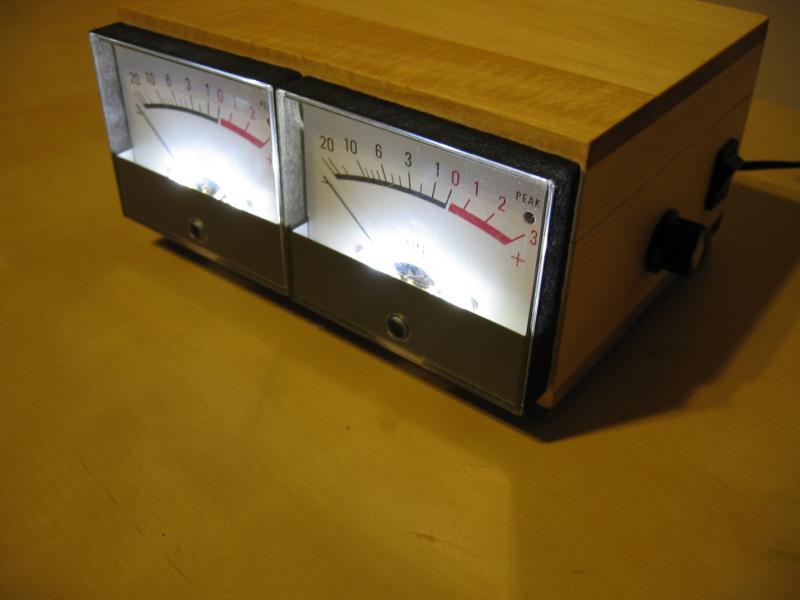 For this project, I took some analog VU meters from a broken Otari 5050 2-track tape machine (thanks Ralph!), and assembled a standalone stereo meter unit based on the VU buffer circuit from JLM Audio. I re-purposed a wooden box for the enclosure, drilling holes for the input jacks and meters, and applied a 'tung oil style' finish. As a final touch, I swapped the old meter bulbs with LEDs and added a dimmer knob on the side to adjust brightness.