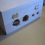 This box is a passive line level switch utilizing a 5 position, 6 pole rotary switch. It takes two balanced signal inputs and allows you to switch between 5 different outputs. Before we upgraded to an SM Pro Audio Passive-1, we had it setup at the studio with a Blue Sky 2.1 system, Adam A5s, and a FM transmitter to allow playback on a nearby radio. Spray lacquer finish on a wooden enclosure.